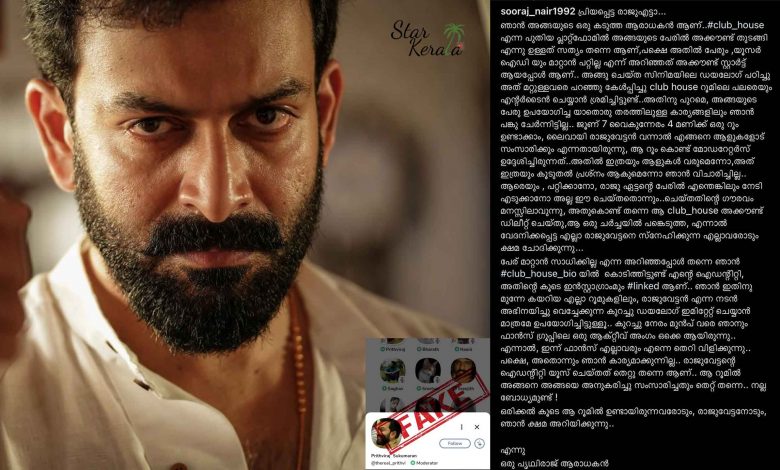 വ്യാജ ക്ലബ് ഹൗസ് അക്കൗണ്ട് ; പൃഥ്വിരാജിനോട് മാപ്പ് പറഞ്ഞ് മിമിക്രി കലാകാരന്